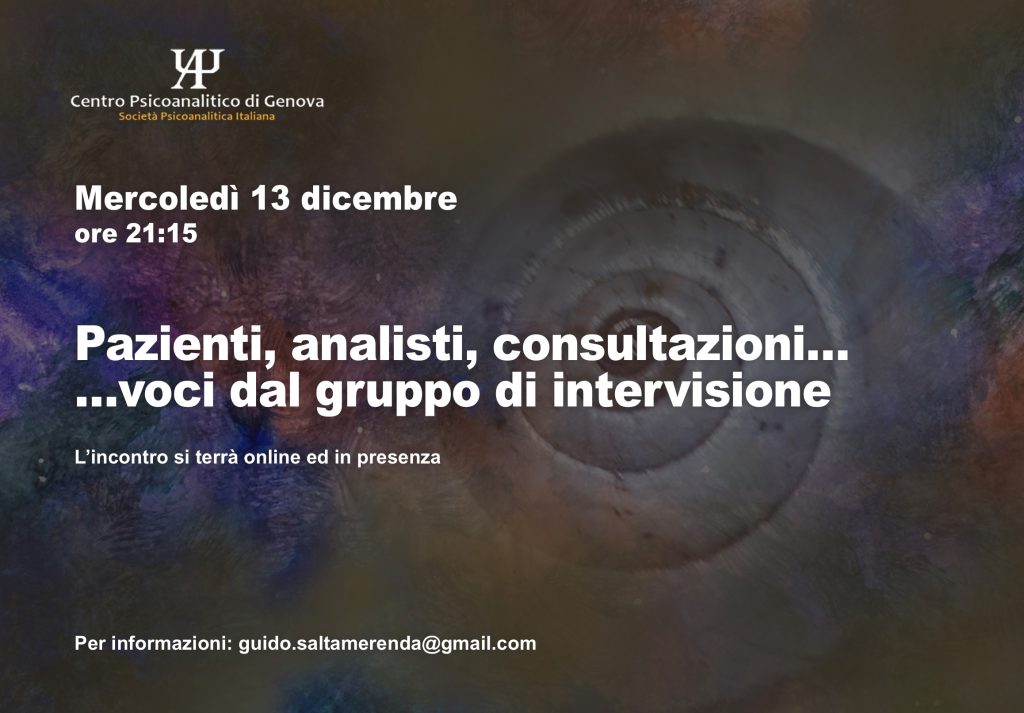 Il gruppo di intervisione del Centro Psicoanalitico di Genova nasce nel gennaio 2017 composto da 6 candidati, 6 associati e tre ordinari. Sono rappresentate tutte le generazioni degli psicoanalisti genovesi esclusi i fondatori del centro.