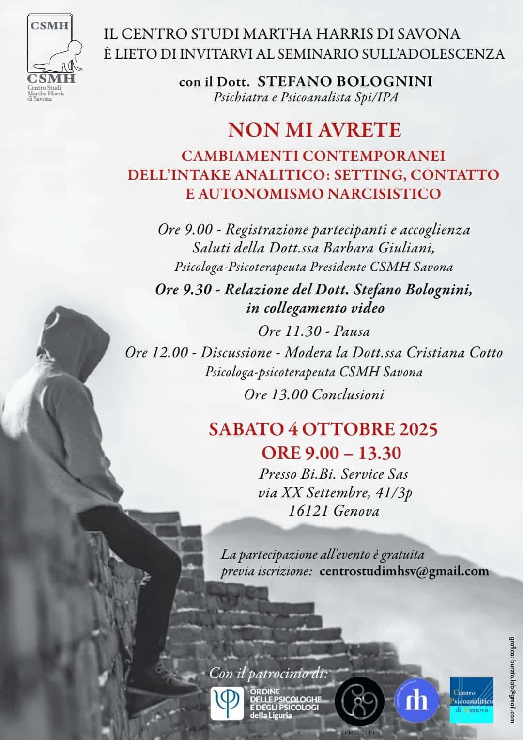 Saluti della Dott.ssa Barbara Giuliani, Psicologa-Psicoterapeuta, Presidente CSMH Savona - Ore 9.30 – Relazione del Dott. Stefano Bolognini (in collegamento video)